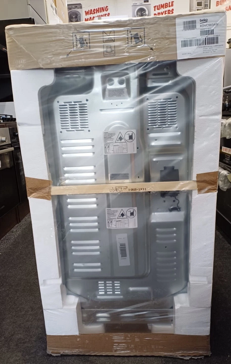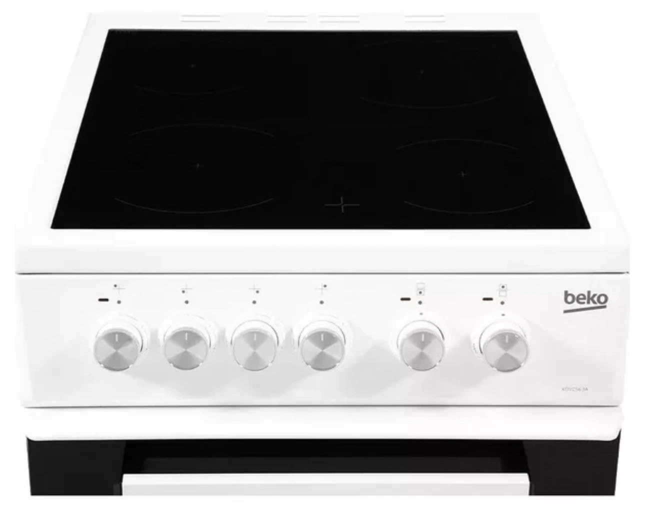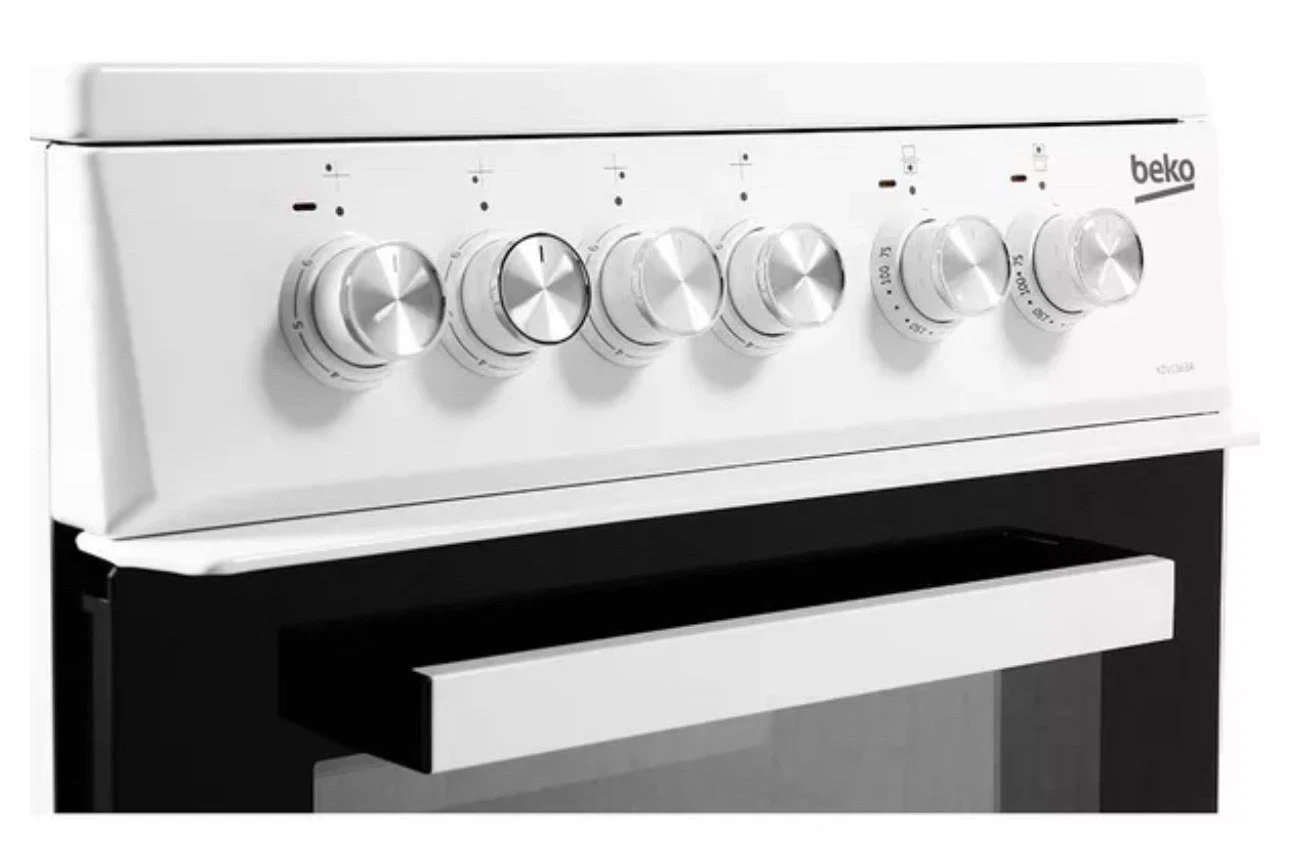 The BEKO KDVC563AW is a sleek white freestanding electric cooker in a compact 50 cm width format, designed to fit in modern kitchens without compromising on capacity. It features a 4-zone ceramic hob for fast efficient cooking, combined with a generous 58 litre fan main oven and a 31 litre conventional second oven, perfect for multi-dish cooking. The integrated electric grill adds versatility, while the enamel-coated oven cavities and removable door glass panels make cleaning straightforward. :contentReference[oaicite:3]{index=3}
