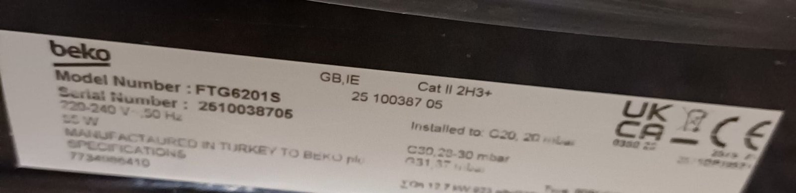 | Box contents | Beko FTG6201S 60 cm Gas Cooker • Rating label • Barcode label • Guarantee label • Gas standard warning label • Warning label • User manual • Energy labels • Product fiches • Wire shelves x 3 • Grill pan set with handle |
