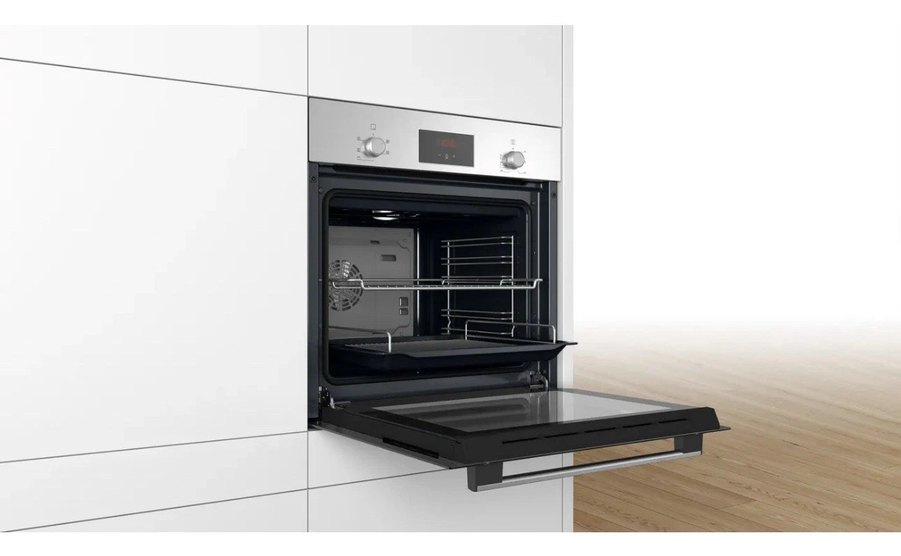 The interior features a grease-proof enamel coating and a full-glass inner door for easier cleaning. Supplied with a universal pan and grids/shelves, this built-in Bosch oven offers dependable performance with an A energy rating – perfect for busy family kitchens.