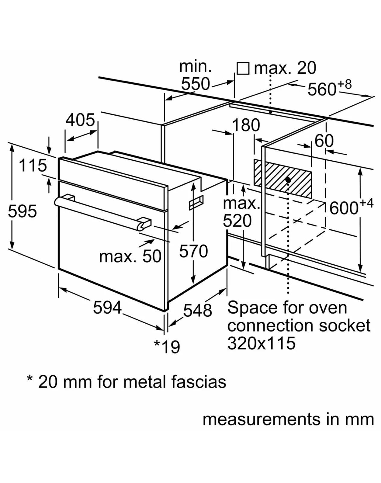 | Niche / cut-out (H × W × D) | H 575–597 × W 560 × D 550 mm (check installation manual) |