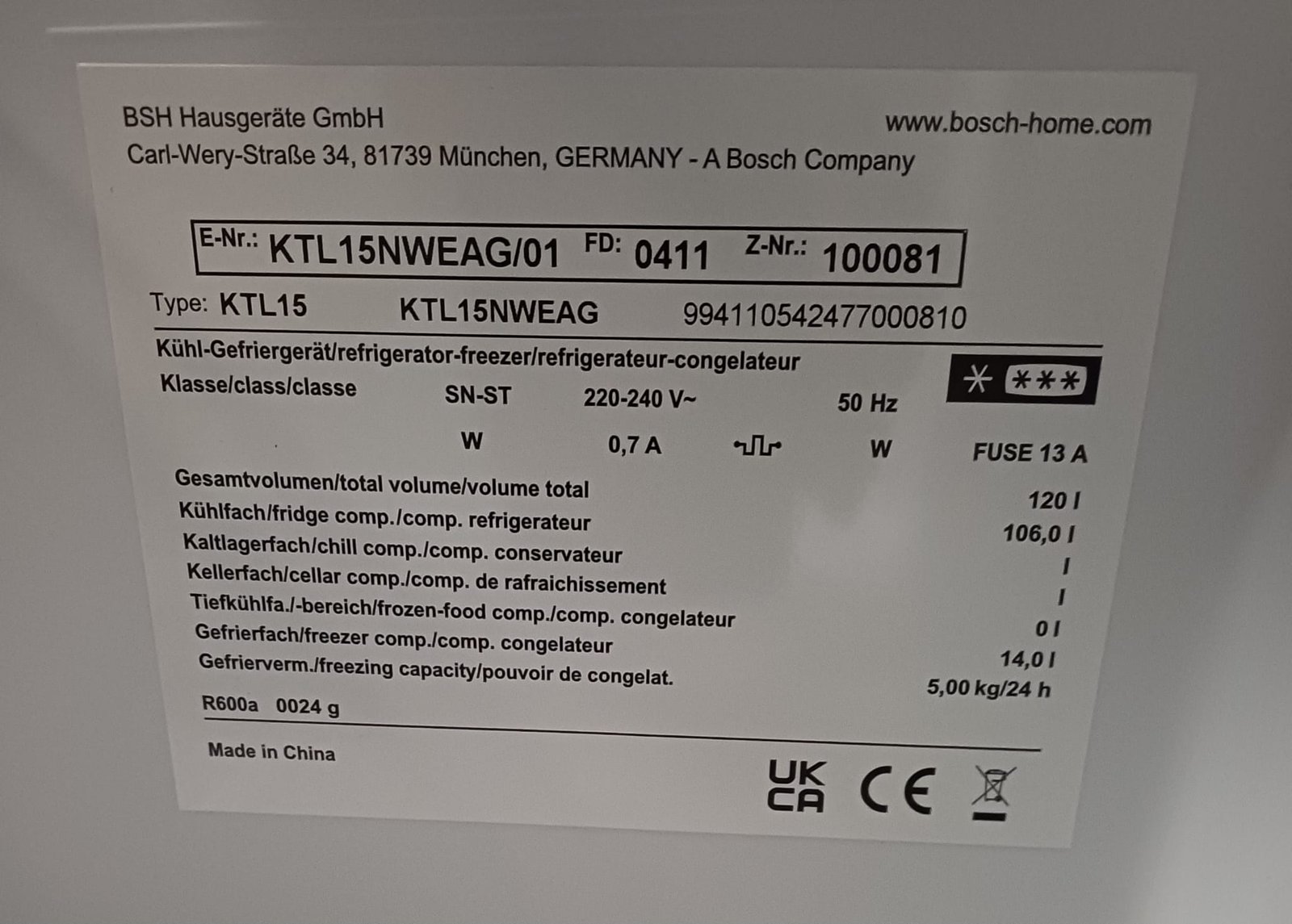 | Box contents | Bosch Series 2 KTL15NWEAG Undercounter Fridge • Egg trays x 2 |