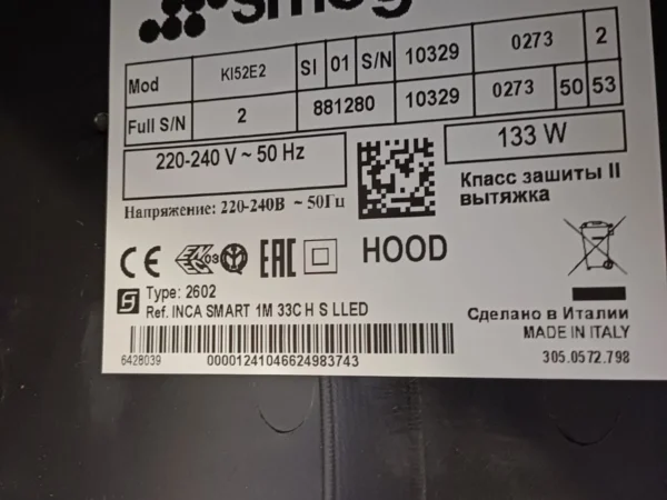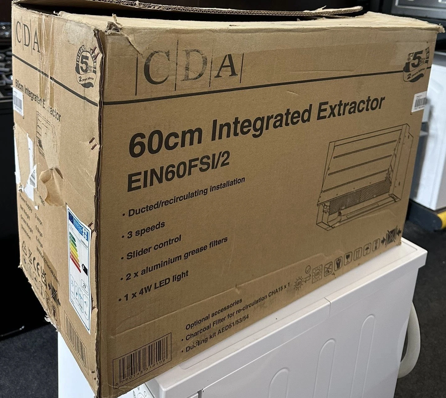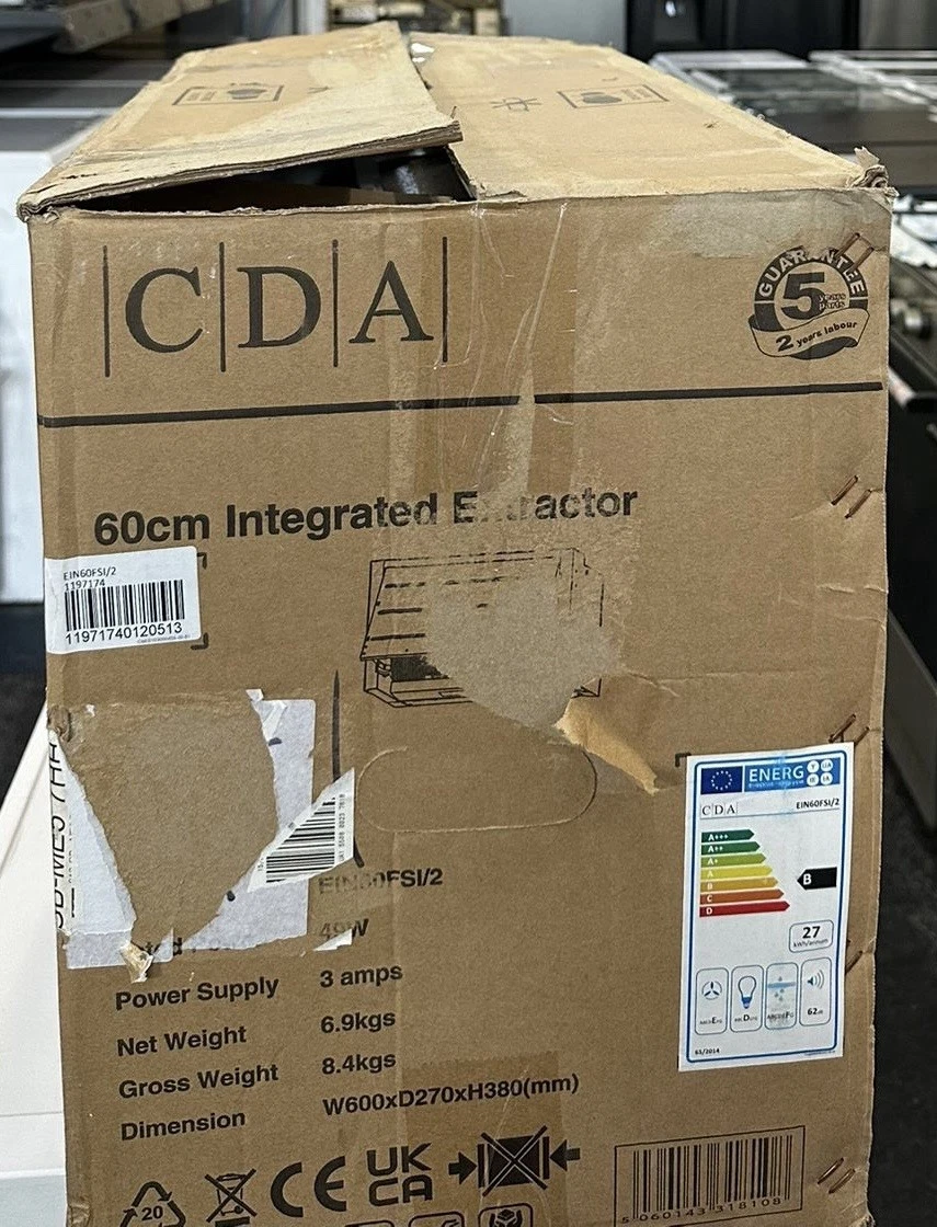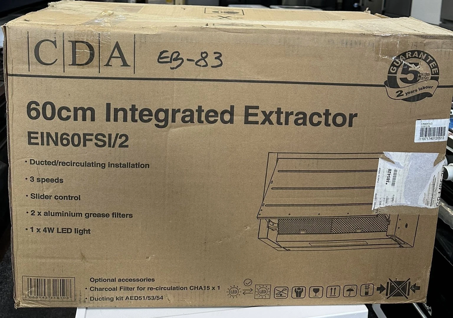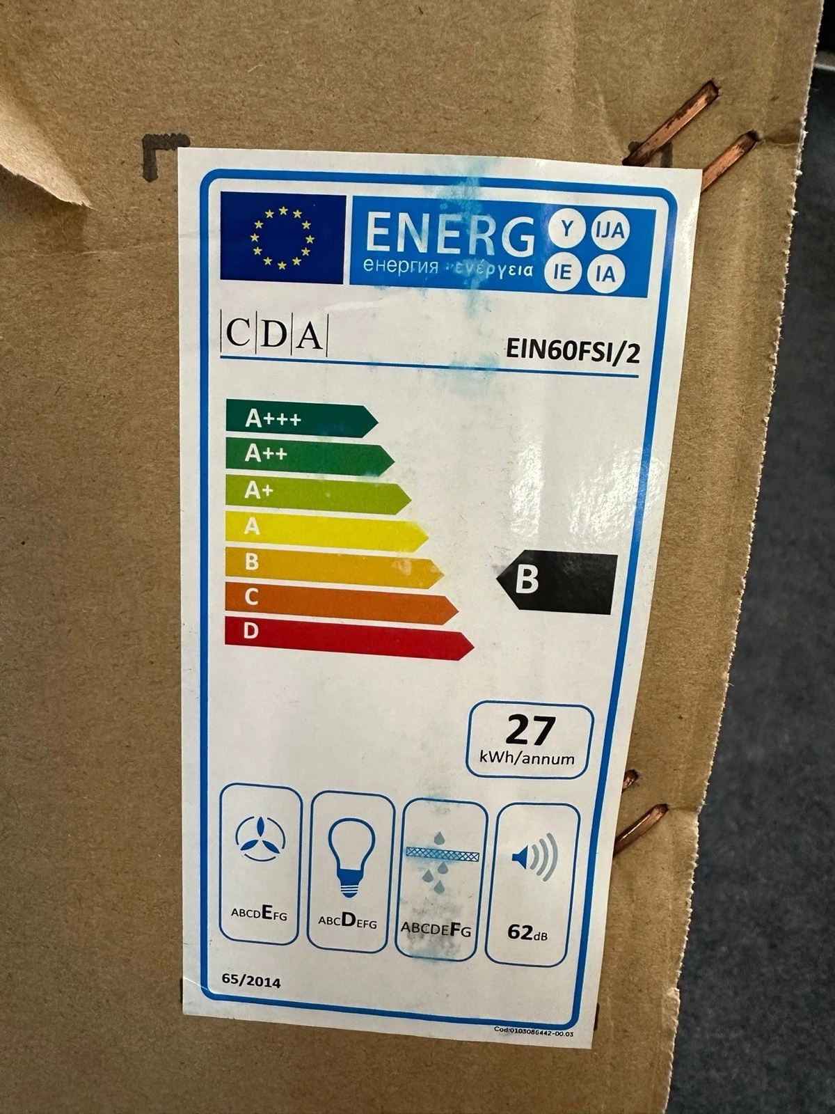 | Box contents | CDA EIN60FSI Integrated Extractor • Aluminium grease filters • Fixing kit • User manual • Energy label |