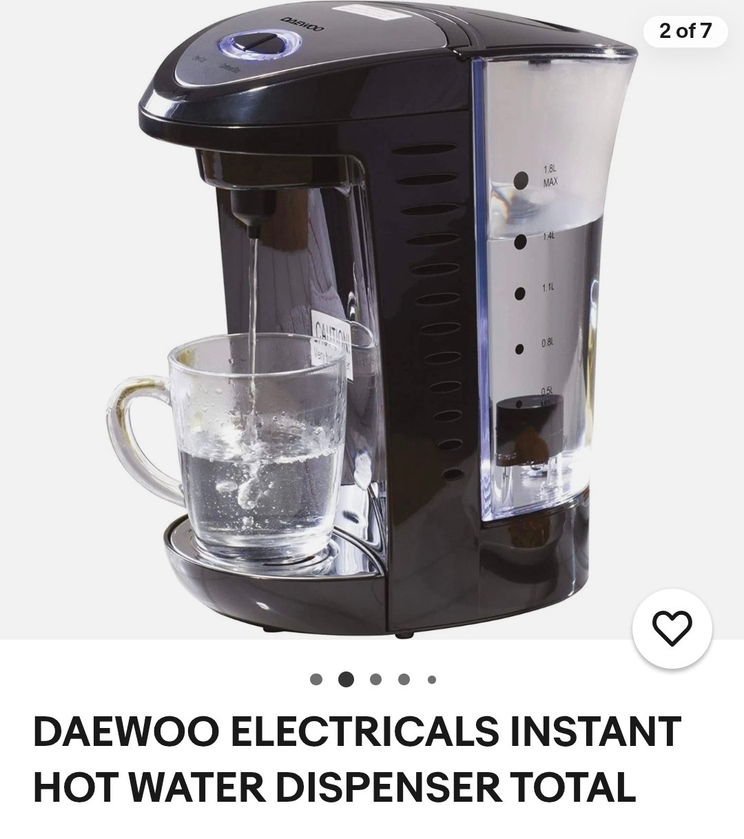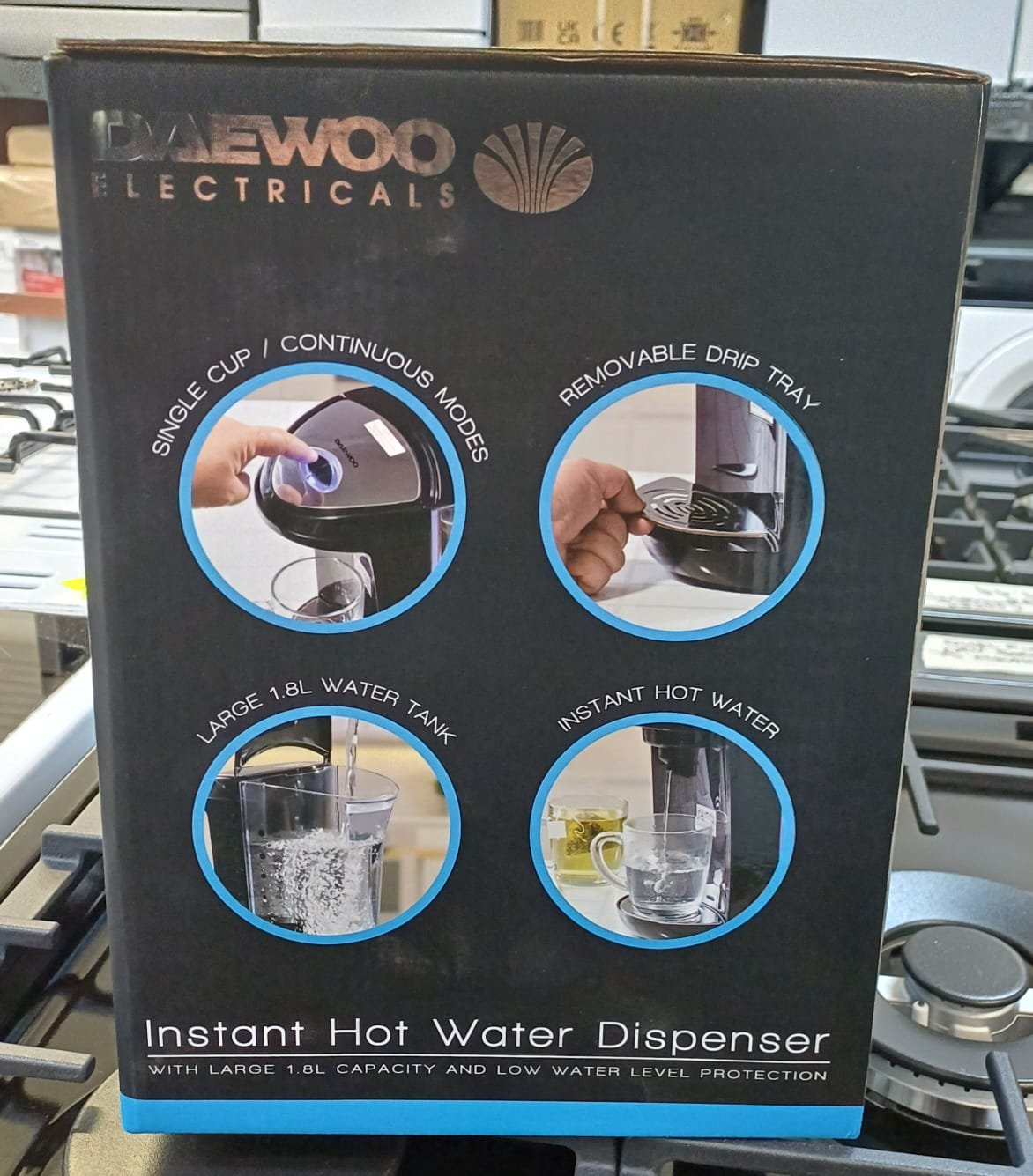 | Box contents | Daewoo 1.8L Instant Hot Water Dispenser • Drip tray • User manual |