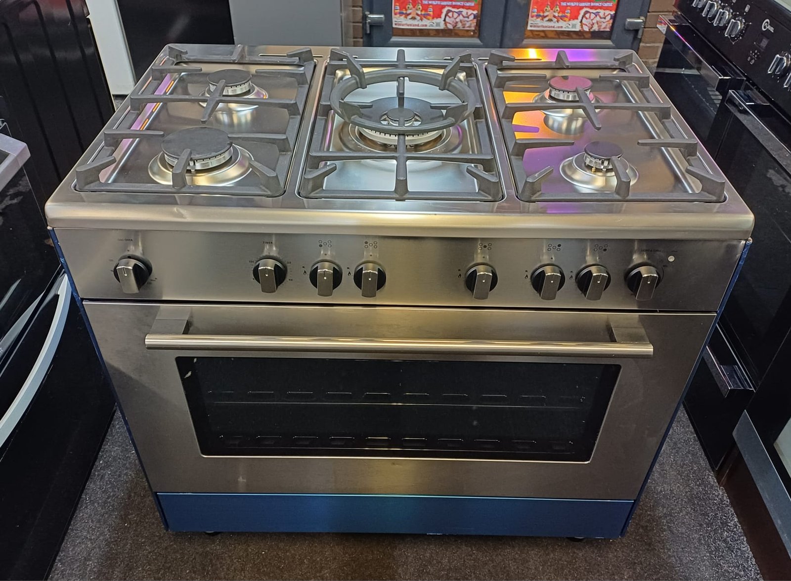 90 cm stainless steel gas hob • 5 burners incl. double crown wok burner • Gas oven with thermostatic electric grill • 106 L single cavity • Cast-iron pan supports & wok stand • LPG conversion kit included