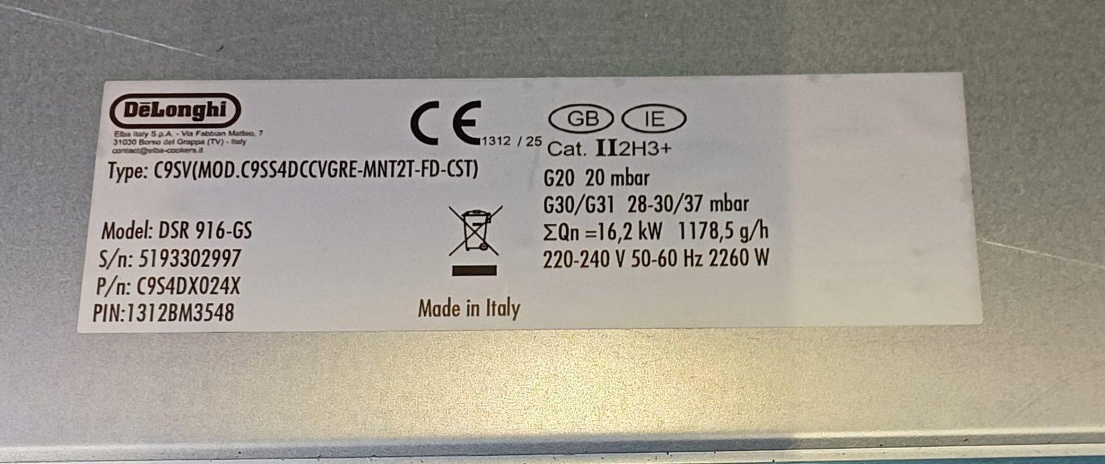 | Box contents | DeLonghi DSR 916 GS 90 cm Single Cavity Gas Range Cooker • Grill pan • Trivet • Two wire handles • Shaped shelf • Stainless steel adjustable feet • LPG conversion kit • User manual & documentation |