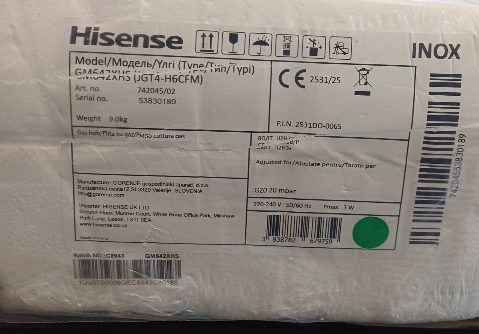 | Box contents | Hisense GM642XHS Gas Hob • Cast iron pan supports • LPG conversion kit • Installation guide • User manual |