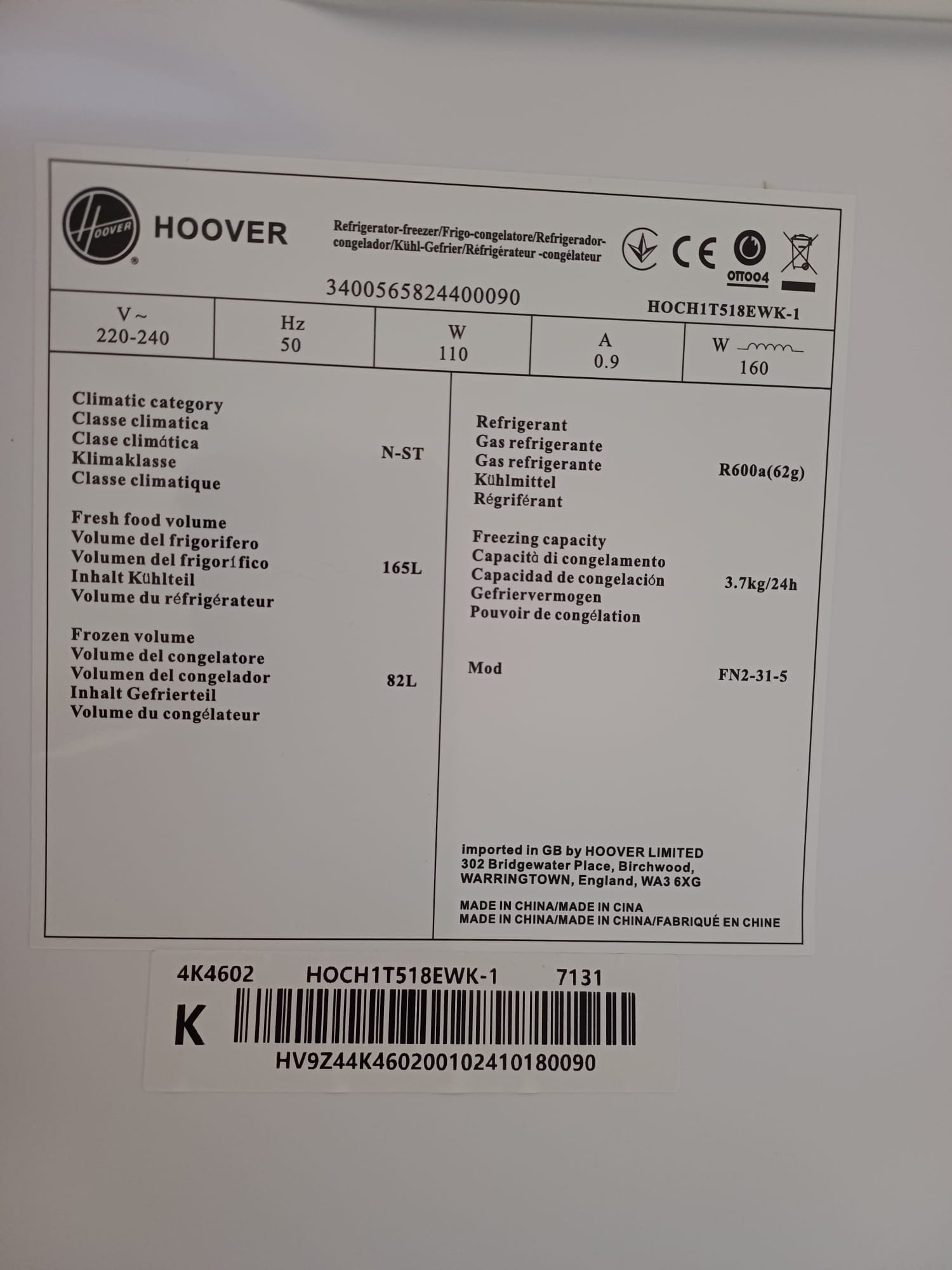 | Box contents | Hoover HOCH1T518EWK-1 50/50 Fridge Freezer • Energy label • User manual |