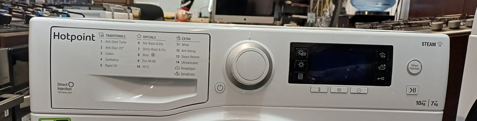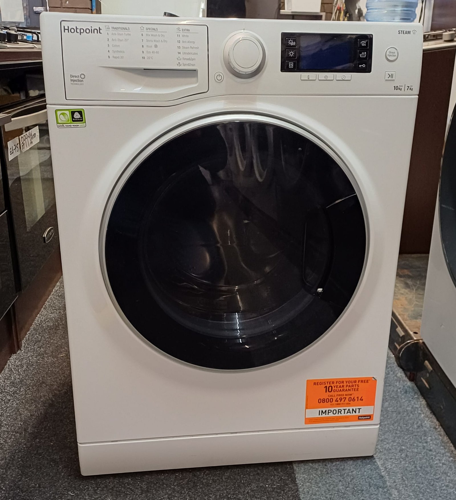 The Hotpoint RD 1076 JD UK is a reliable freestanding washer dryer designed to handle busy households with a generous 10 kg wash and 7 kg dry capacity. Benefit from direct injection technology which pre-mixes detergent and water for a deeper clean, and steam technology that adds an extra steam period at the end of the wash to help remove remaining germs and bacteria. The dedicated wool wash cycle is awarded Woolmark™ Platinum Care to help protect delicate garments, while the advanced brushless motor keeps operation quieter, reaching just 63 dB during drying. With up to 1600 rpm spin speed and a 24-hour delay timer, it fits easily into your routine.