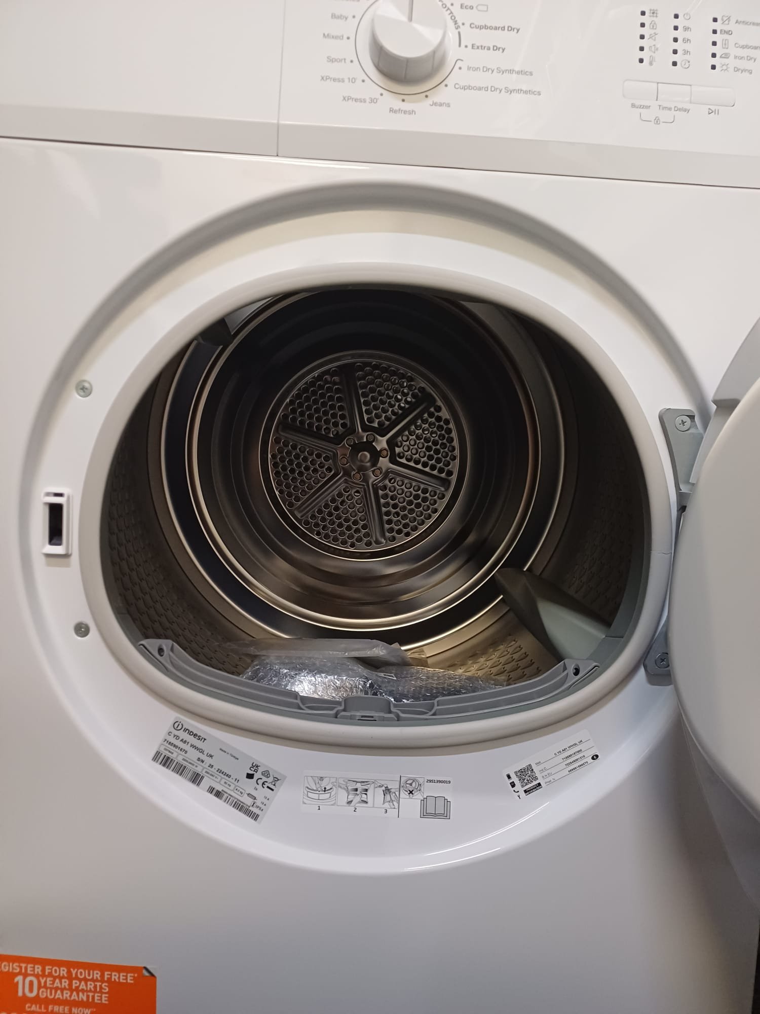 The dryer features timed drying programmes, allowing you to select the exact drying duration to suit your load. Its reverse tumble action helps minimise tangling and creasing, making clothes easier to handle and iron once dry. Combined with easy-to-use dial controls, this appliance offers a straightforward, no-fuss solution for everyday drying needs.
