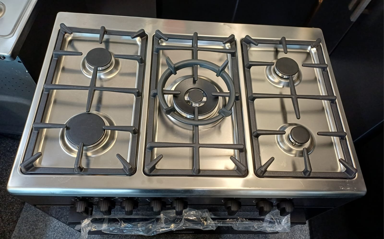 2 electric ovens • Separate grill • 5-burner gas hob with wok burner • A/A energy rating • 90 x 90 x 60 cm (H x W x D) • LPG convertible