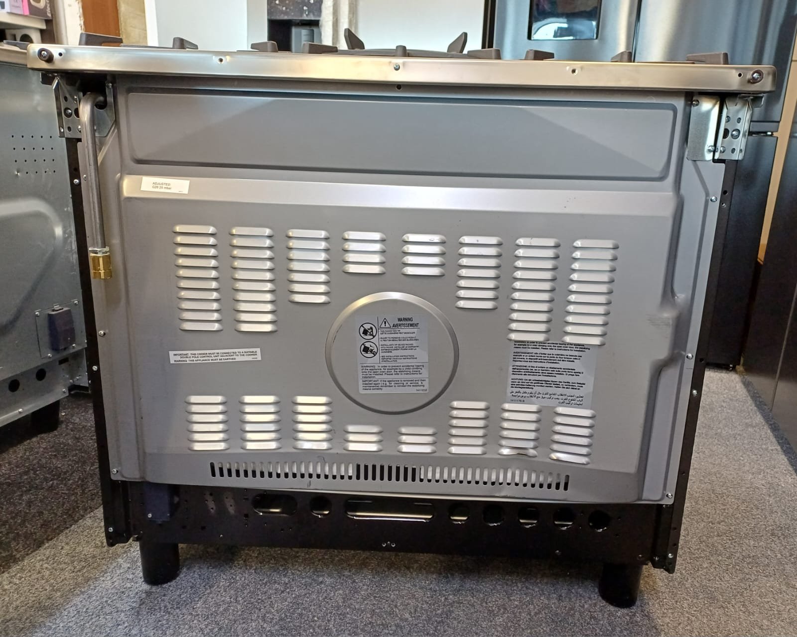 • 90 cm dual fuel range cooker combining responsive gas hob cooking with consistent electric ovens.