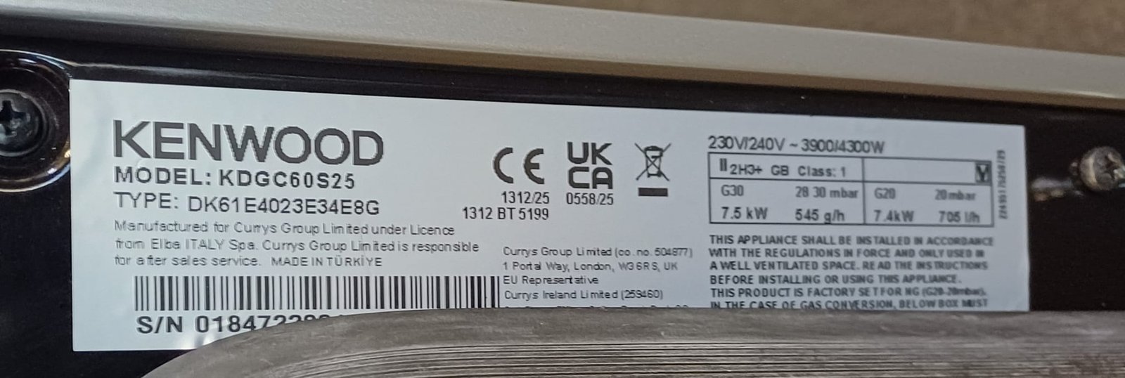 | Box contents | Kenwood KDGC60S25 60 cm Dual Fuel Cooker • Shallow tray • Tray set-grill pan with handle • Chrome wire grid • Gas conversion kit • Tip over bracket |
