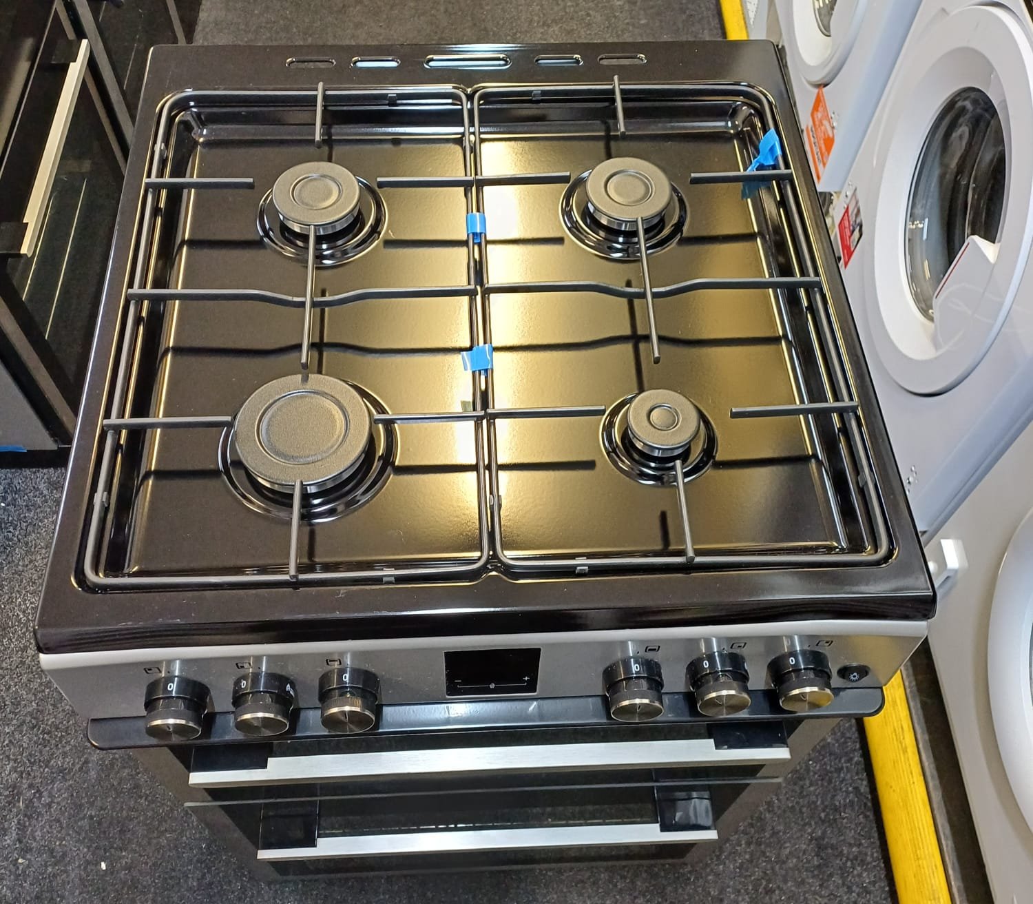 - 60 cm freestanding gas cooker in a sleek silver finish.
