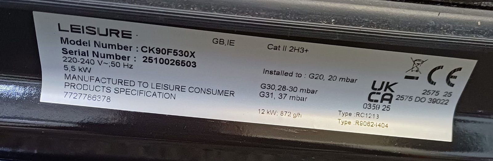 | Box contents | Leisure CK90F530X Range Cooker • User manual • Grill pan & handle • Wire shelves × 7 |