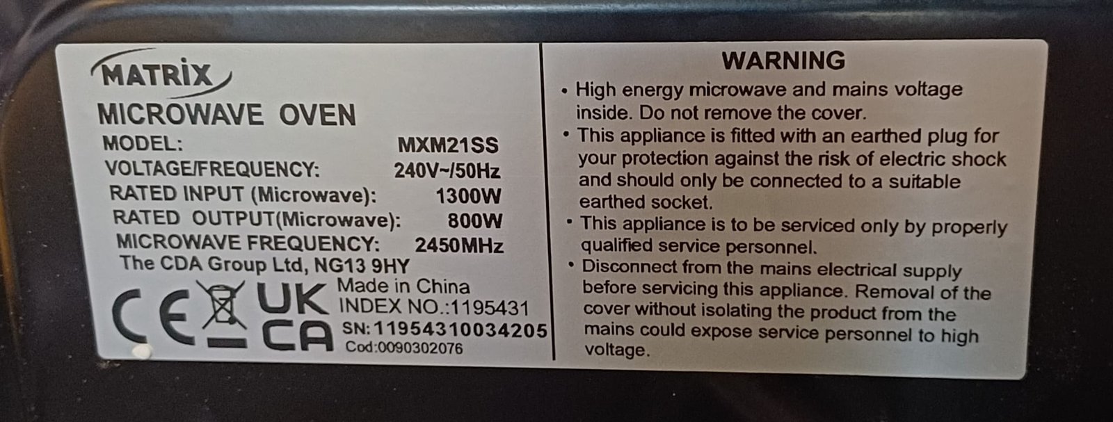 - 21 L capacity suitable for reheating, defrosting and general microwave cooking.