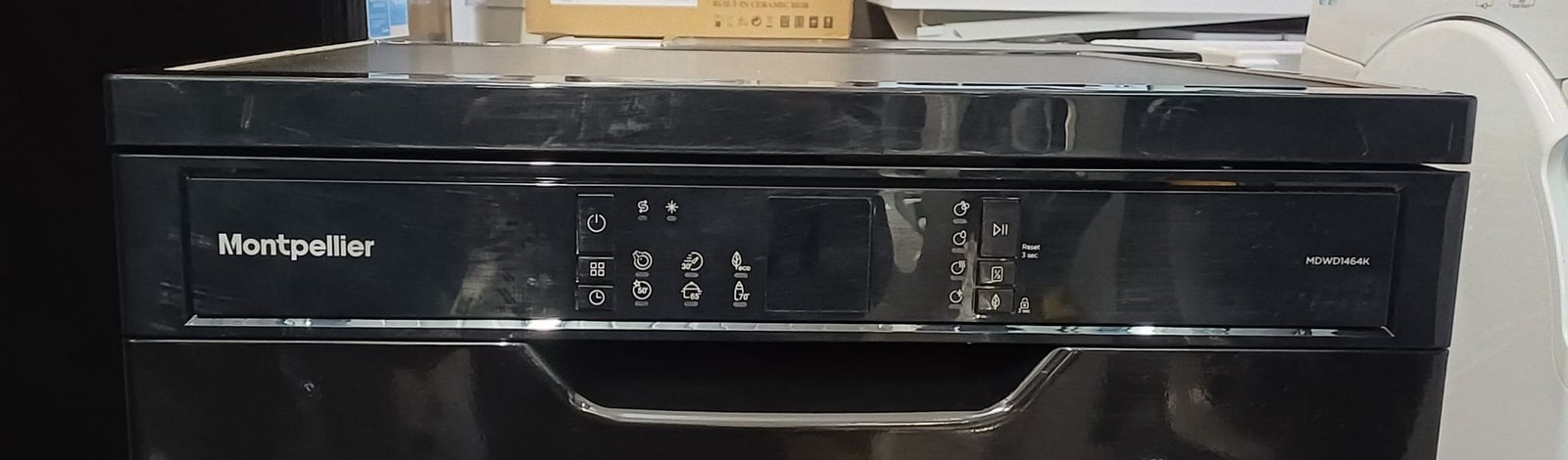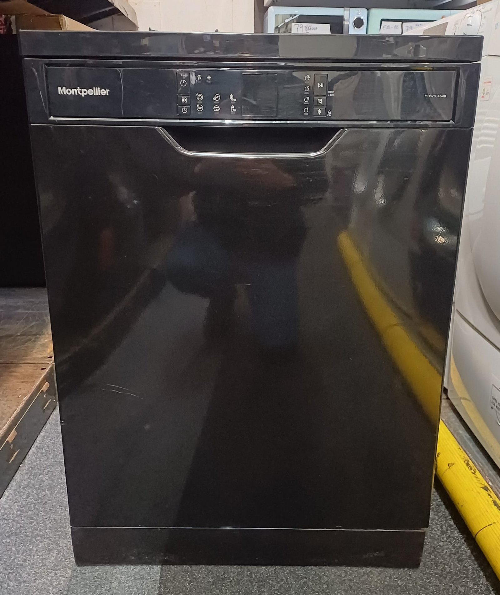 | Box contents | Montpellier MDWD1464K Full-Size Dishwasher • Instruction manual • Warranty card • Energy labels • Water test strip • Fill hose |