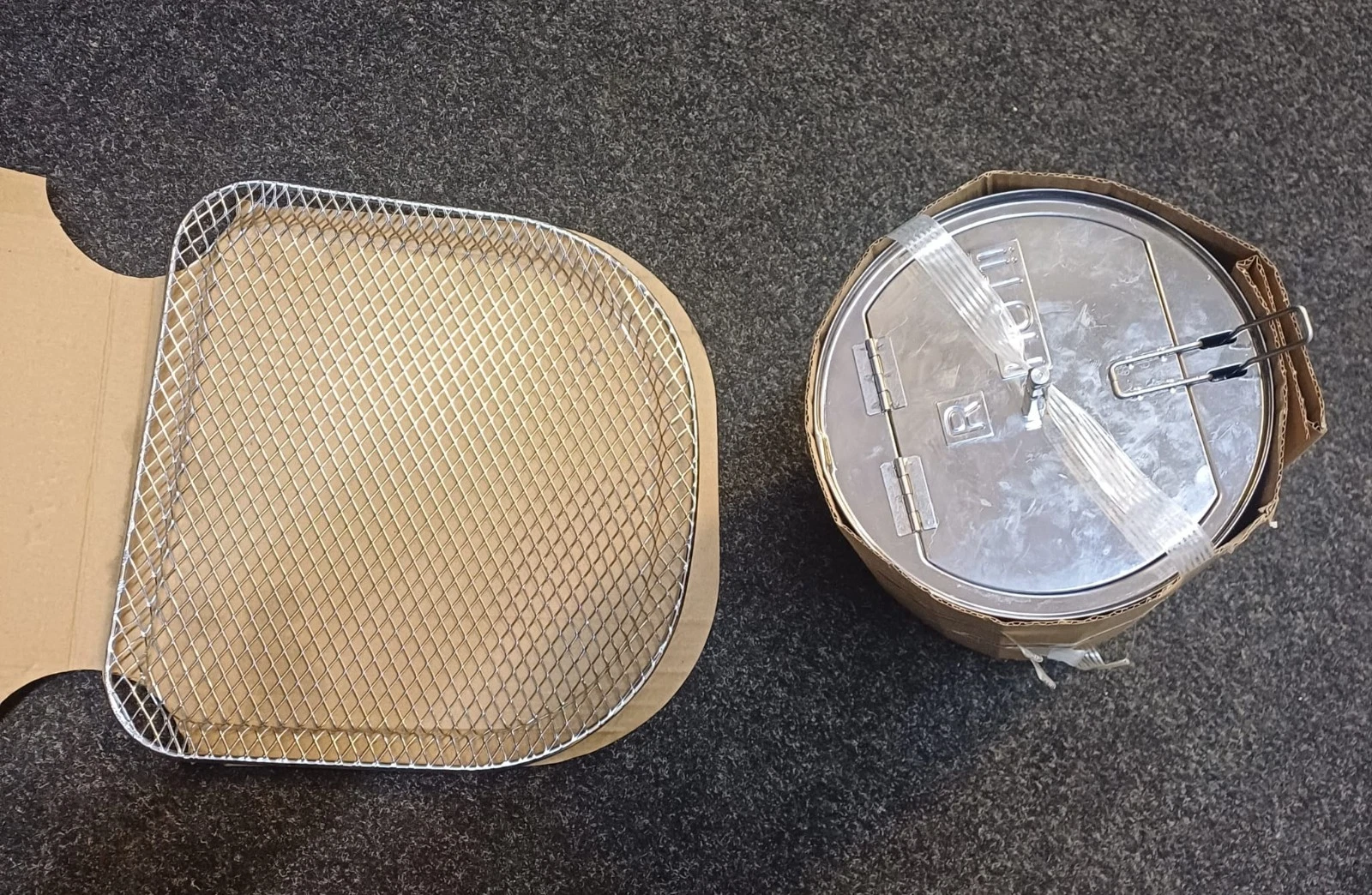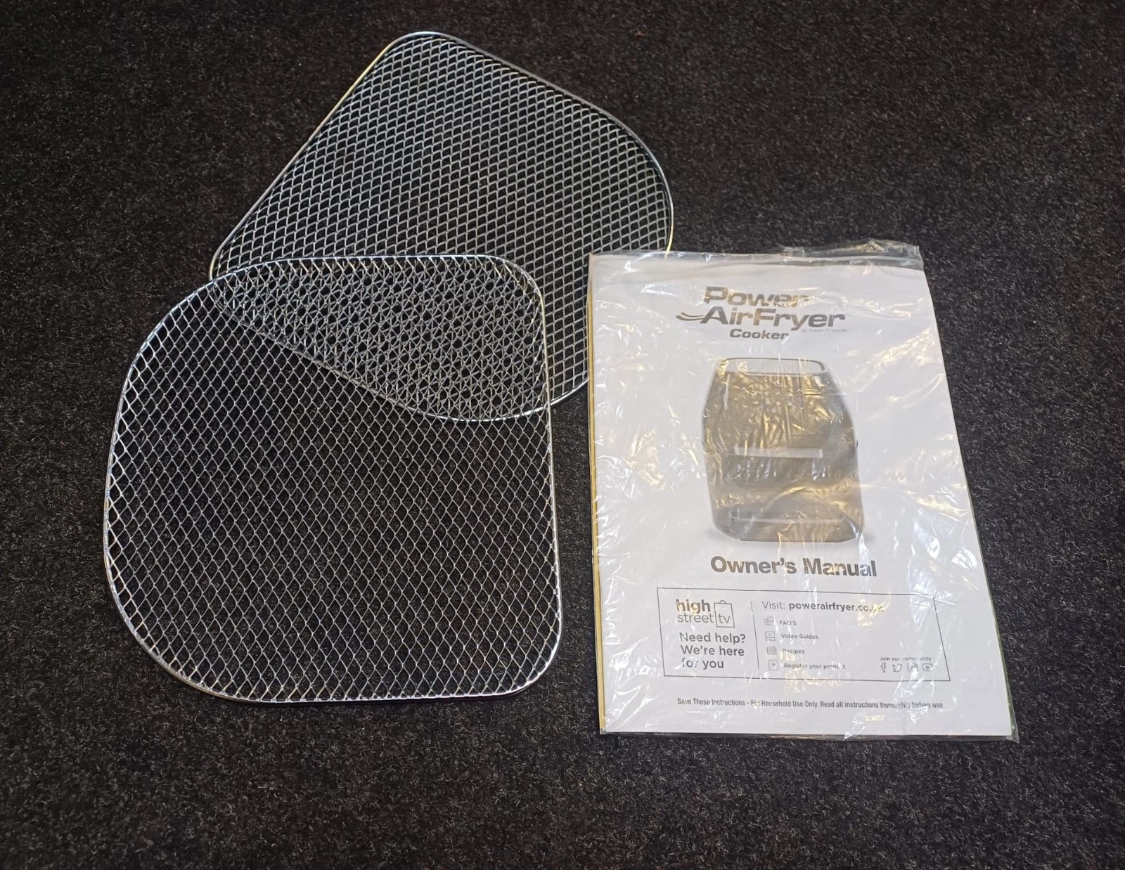 | Box contents | PowerXL 5.7 L Air Fryer Cooker CM-001 • Drip tray • Crisper trays • Mesh basket • Rotisserie set • Skewer set • Fetch/removal tool • User manual |