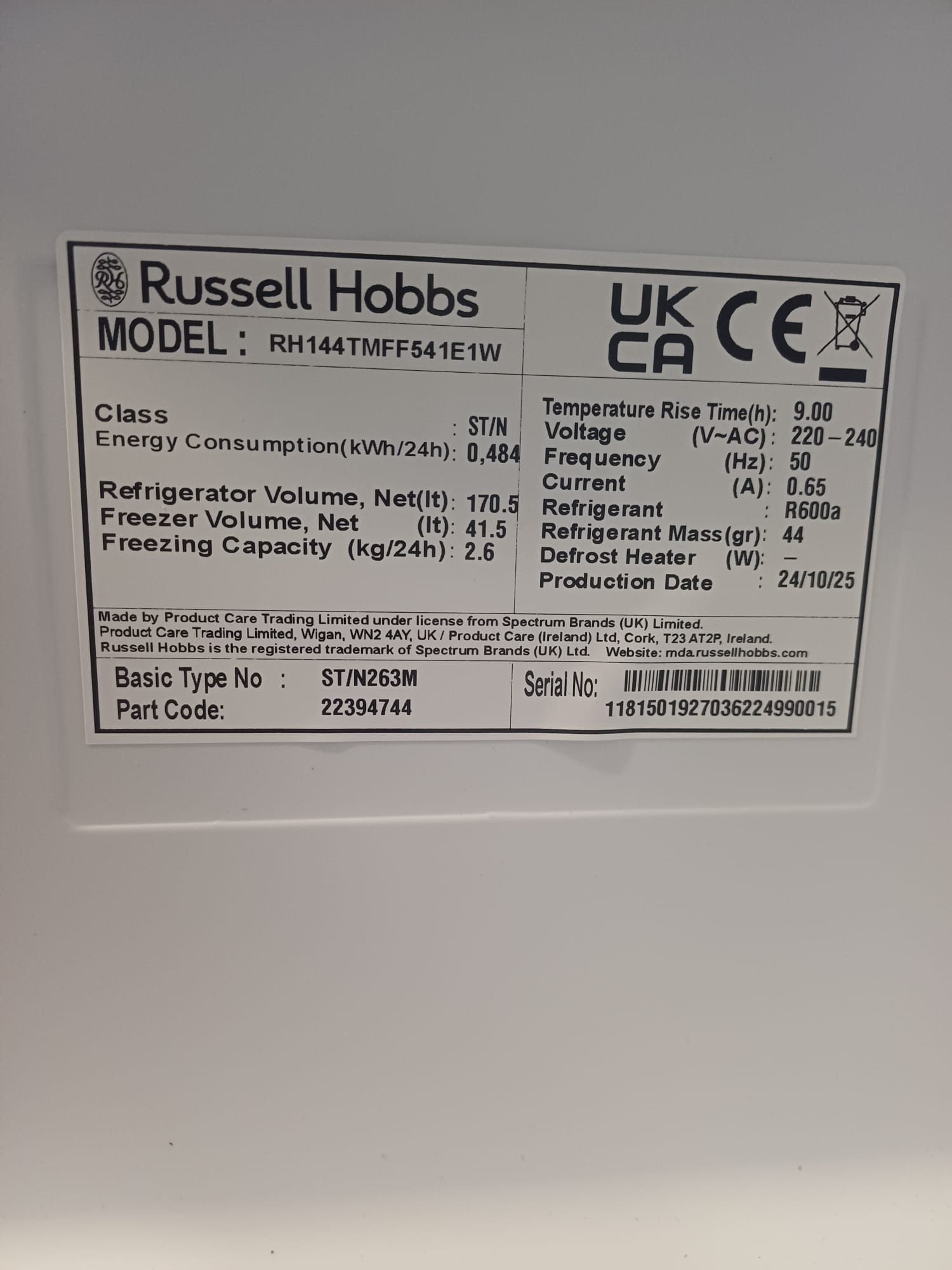 | Fridge capacity | 171 L |