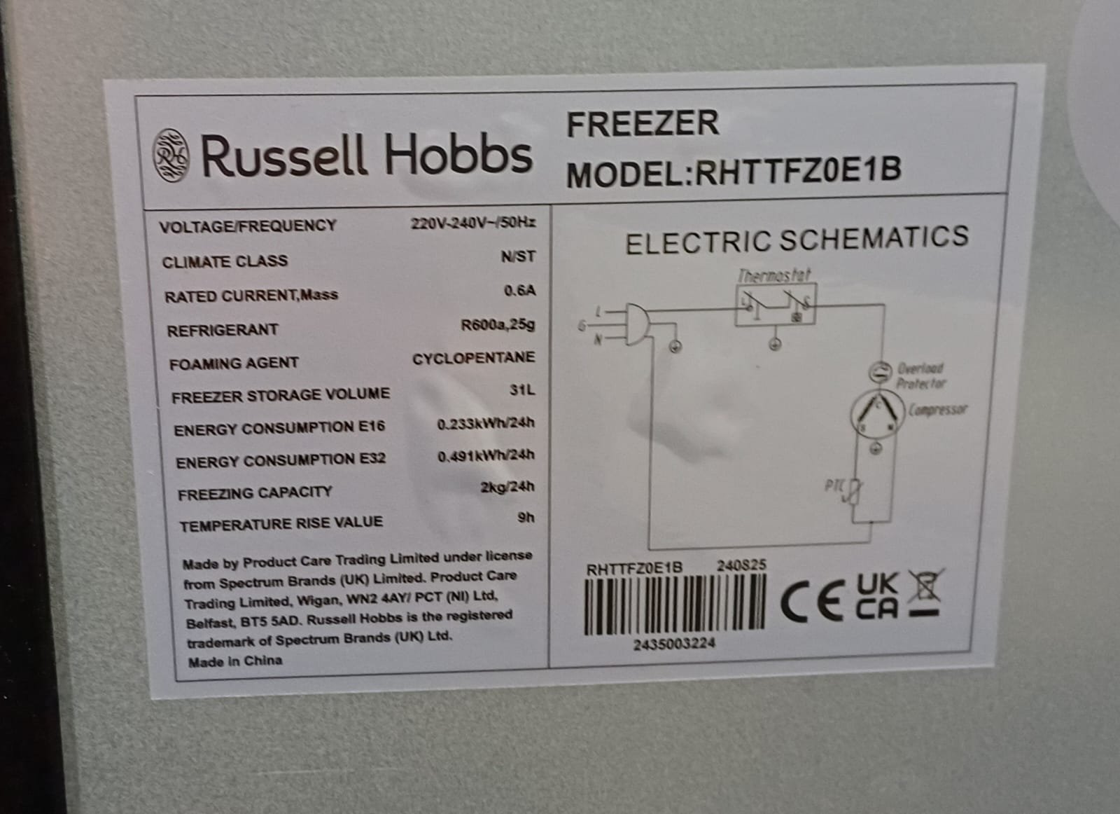 | Freezer storage volume | 31 litres |