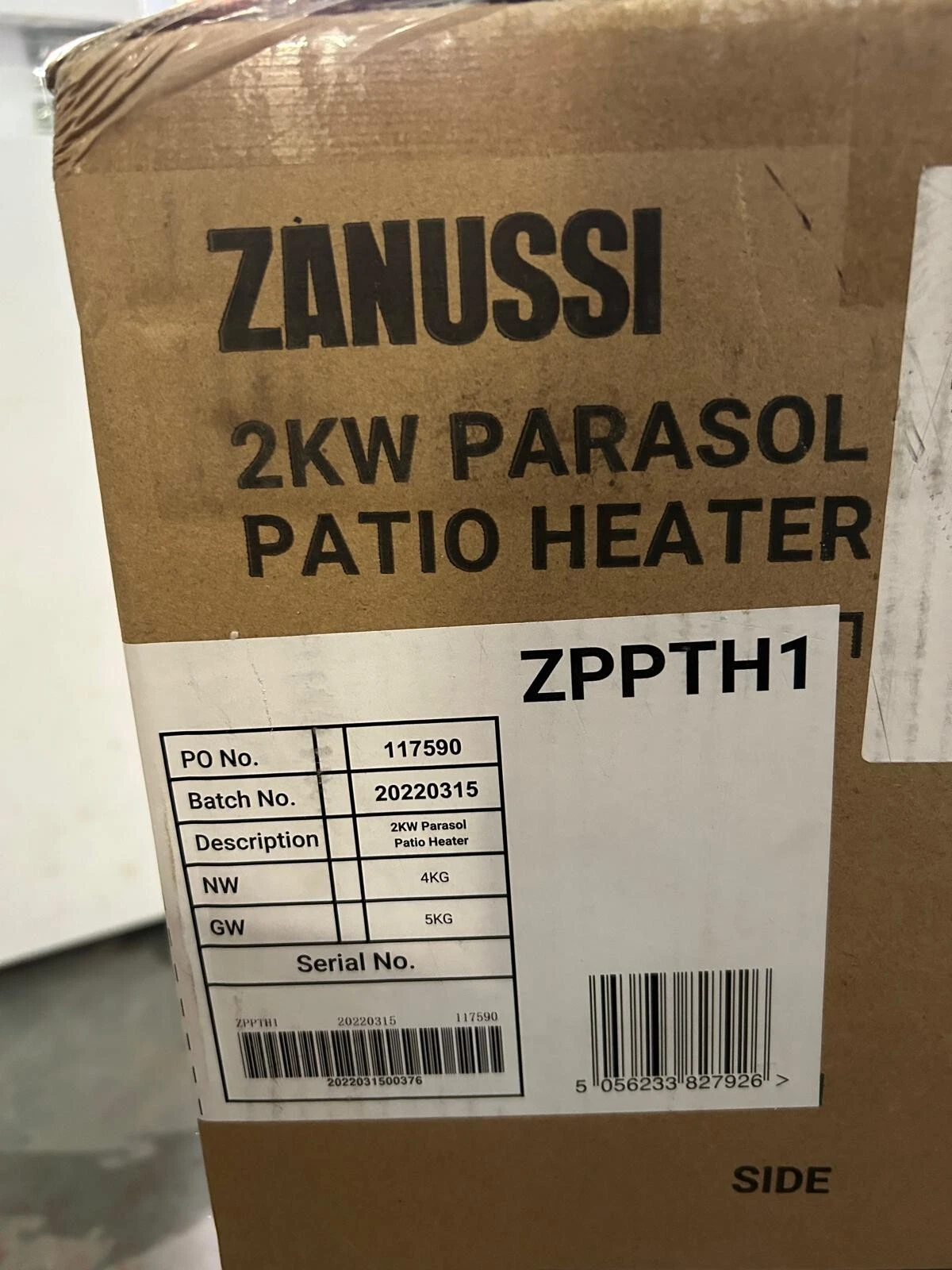 | Box contents | Zanussi ZPPTH1 Parasol Patio Heater • Mounting / clamp hardware • User manual |